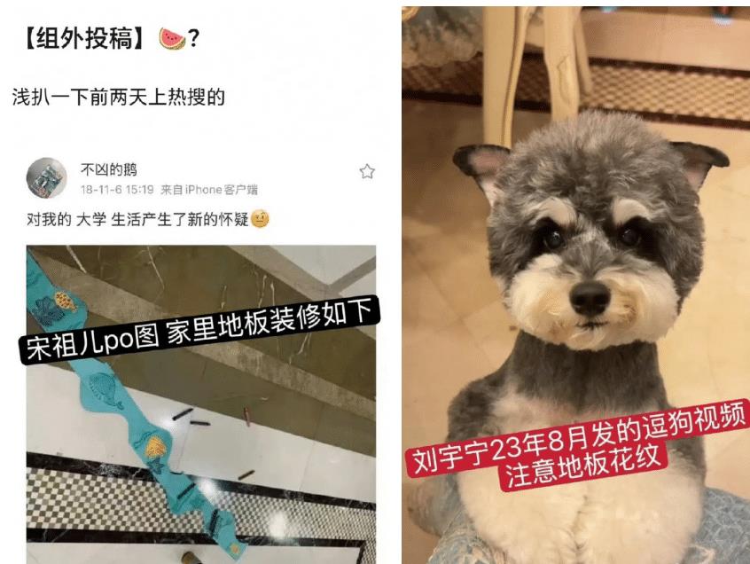 事情本该就此平息,没想到4月22日又有人翻出了新的"铁证"。有人把刘宇宁2023年在粉丝群里发的一段逗狗视频,和宋祖儿2018年的一张家居自拍放在一起对比,专门圈出了地板上几处大理石裂纹,言之凿凿地称"全世界独一份,肯定是同一间房"。